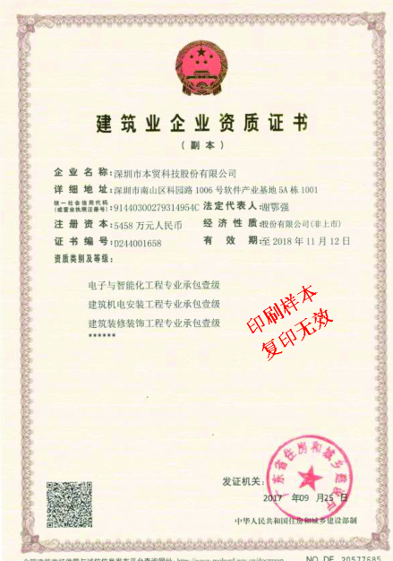電子與智能化工程專(zhuān)業(yè)承包壹級(jí)、建筑機(jī)電安裝工程專(zhuān)業(yè)承包壹級(jí)、建筑裝修裝飾工程專(zhuān)業(yè)承包壹級(jí)